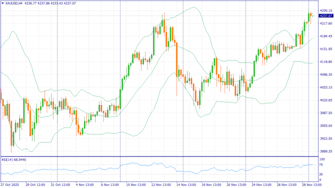 К началу недели спот-котировки удерживаются выше $4 200 за унцию, а новостной фон остаётся благоприятным: рынок оценивает высокую вероятность декабрьского снижения ставки и реагирует на колебания доллара. В краткосрочном горизонте баланс факторов остаётся конструктивным: сочетание мягких ожиданий по политике ФРС, слабого доллара и геополитической неопределённости поддерживает спрос на золото, позволяя целиться в зону дальнейшего роста при умеренных откатах.