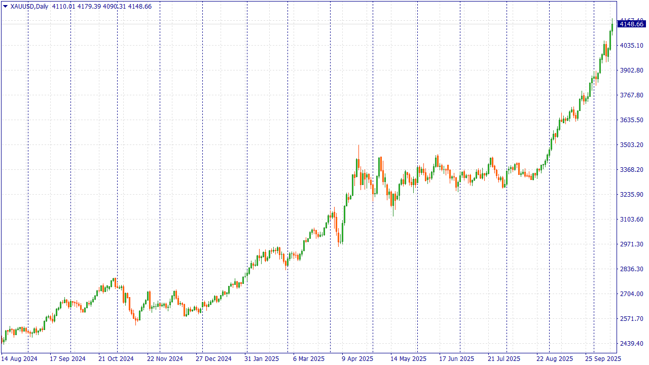 Золото взлетело до $4 179 за унцию — новый рекорд. Рынок подогревают ожидания снижения ставок в США, слабый доллар, покупки металла центробанками и притоки в фонды. Геополитические риски добавляют «премию за защиту», подталкивая инвесторов к надёжному активу.