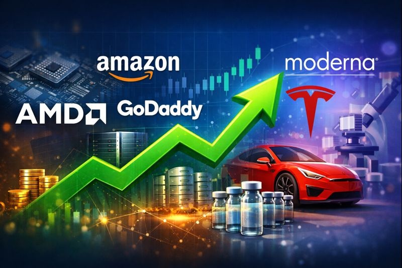 В январе наши клиенты чаще всего торговали акциями #AMD, #Amazon, #GoDaddy, #Tesla и #Moderna - и именно по ним зафиксирована максимальная доля прибыльных сделок. Сегодняшний обзор посвящён американским акциям: квартальные отчёты, спрос на технологии и новости о новых продуктах задают тон началу 2026 года.