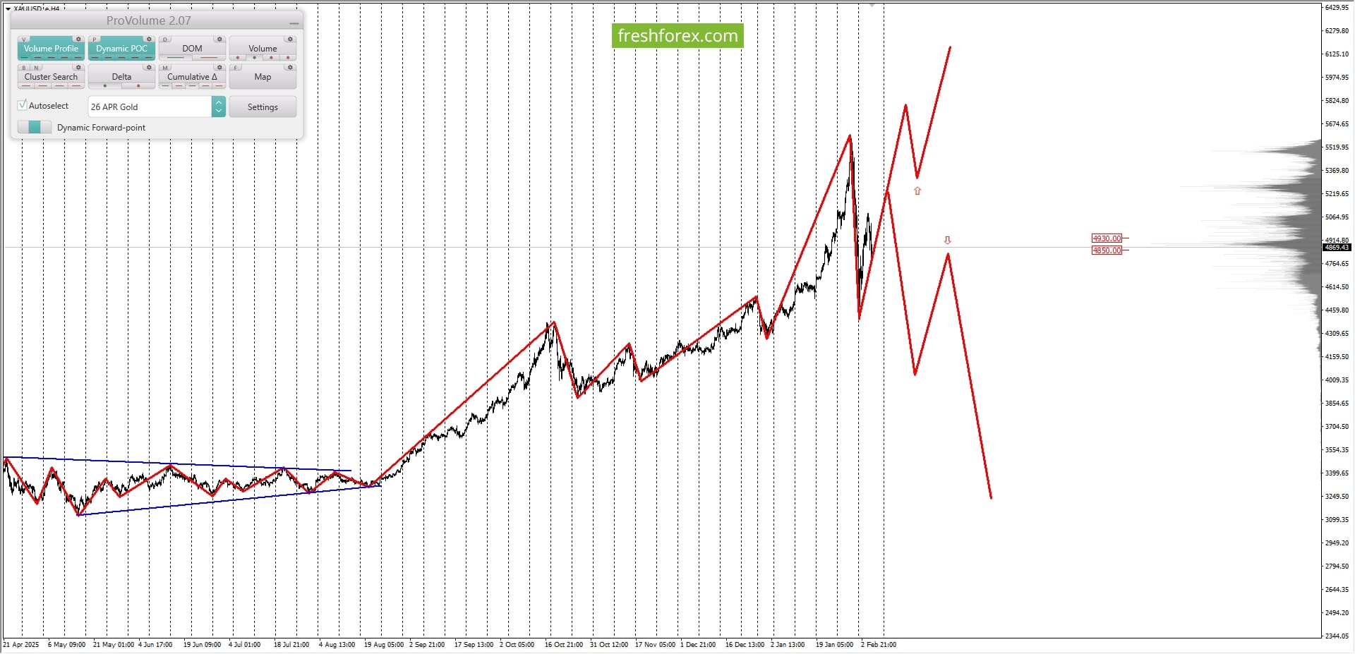 • Долгосрочная тенденция: в лонг. Максимальное скопление объемов текущего контракта расположено в диапазоне, по котировкам 4850.00–4930.00. В настоящий момент по XAUUSD совершаются инвестиционные операции внутри указанного диапазона, что говорит о временной неопределённости.