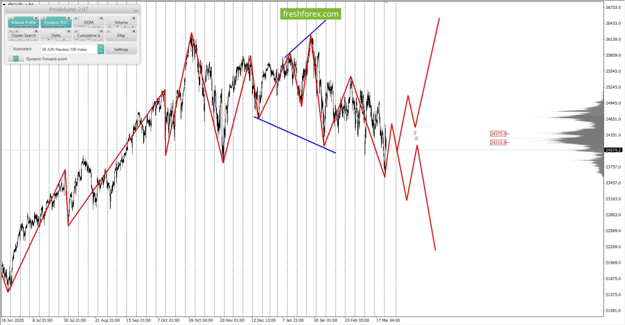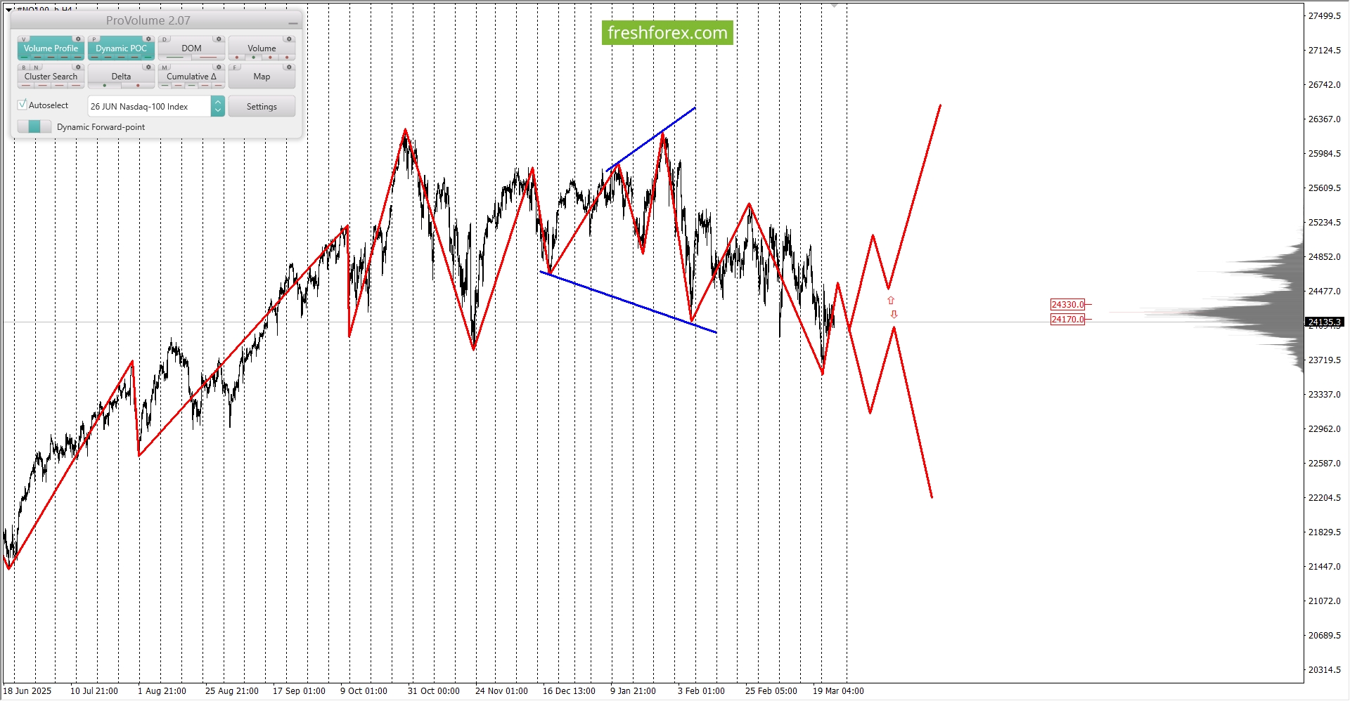 Долгосрочная тенденция: в шорт. Максимальное скопление объемов текущего контракта расположено в диапазоне, по котировкам 24170.0–24330.0. В настоящий момент по #NQ100 совершаются инвестиционные операции ниже указанного диапазона, что говорит о слабости покупателей.