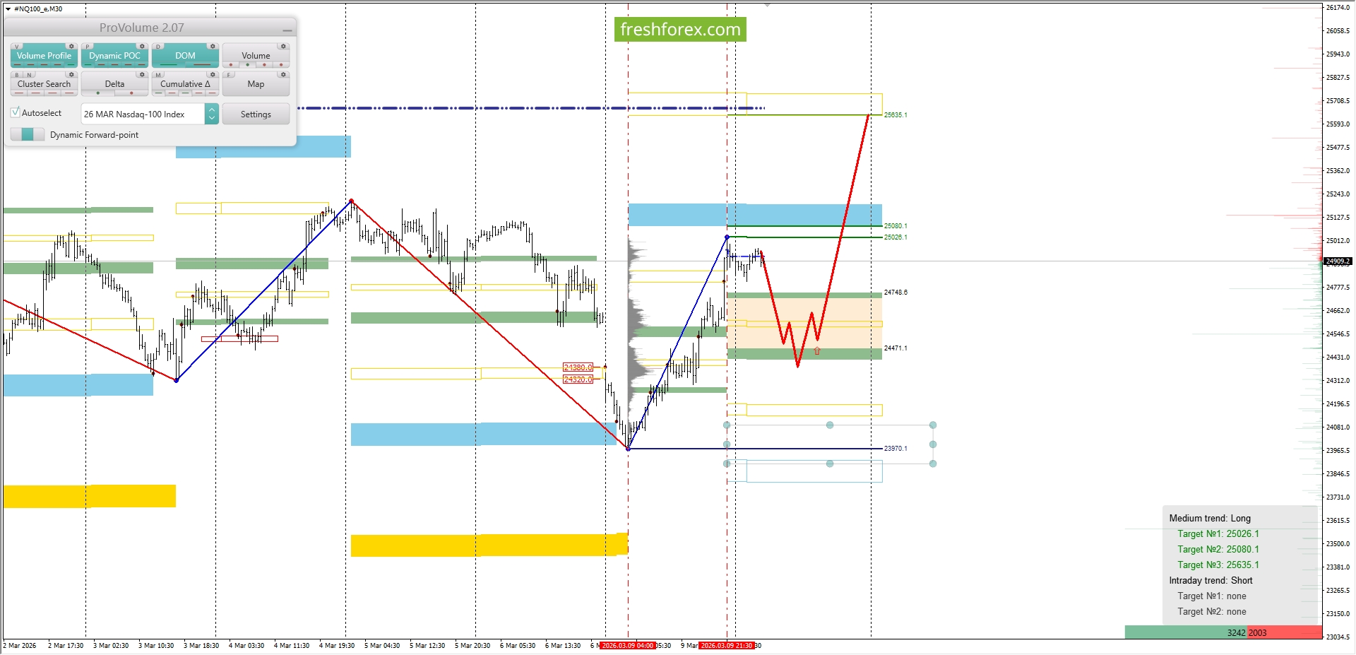 Среднесрочные цели: тест нижней границы ЗНКЗ – 25635.1.#NQ100: BUY 24471.1-24748.6, TP1-25026.1, TP2-25635.1.