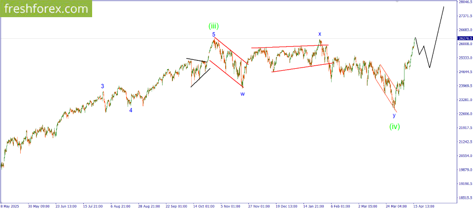 Индекс продолжил достаточно уверенно продвигаться вверх, вплотную приблизившись к своему историческому максимуму. Как ранее отмечалось, вероятно, в данный момент идет формирование восходящего импульса, который является частью волны (v) еще более старшего временного отрезка.