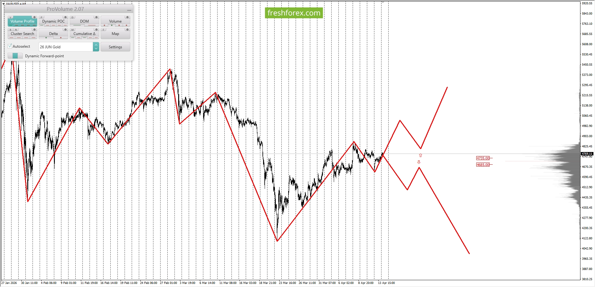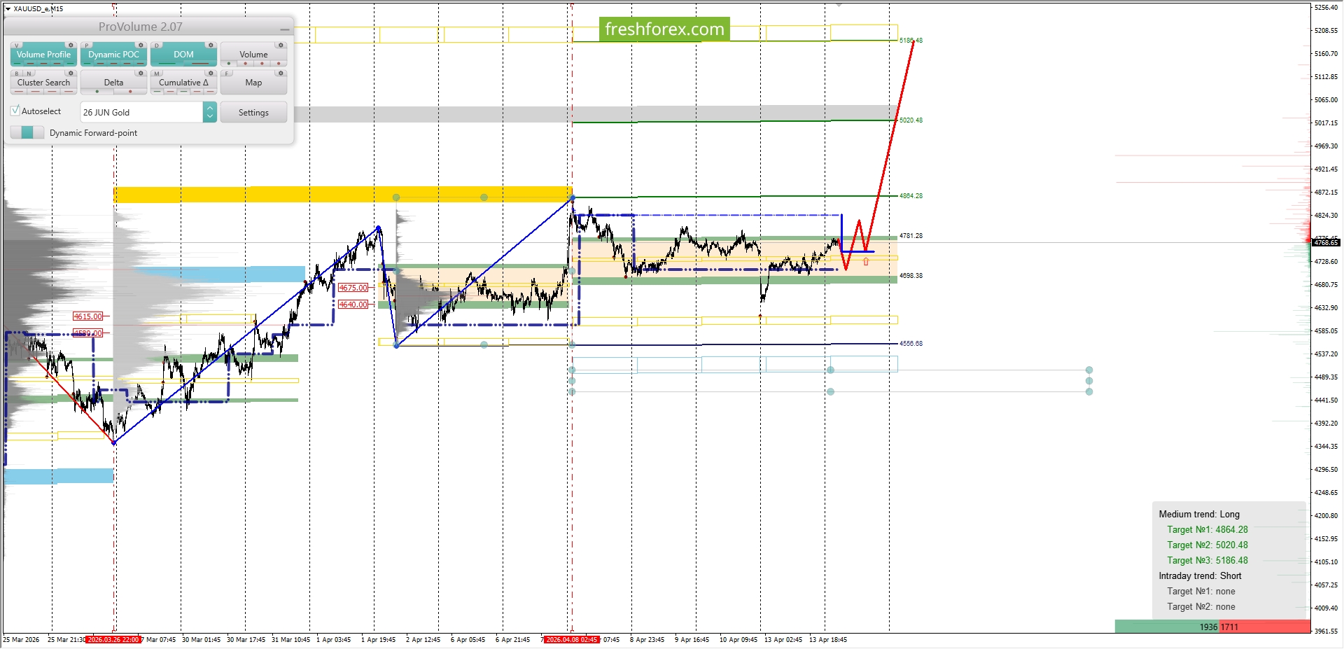 Долгосрочная тенденция: в лонг. Максимальное скопление объемов текущего контракта расположено в диапазоне, по котировкам 4685.00–4735.00. В настоящий момент по XAUUSD совершаются инвестиционные операции выше указанного диапазона, что говорит о силе покупателей.