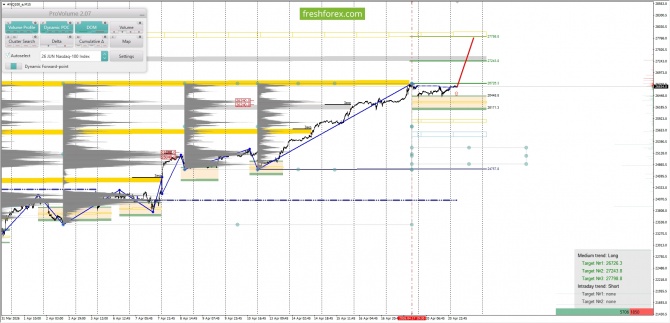 Среднесрочная тенденция: в лонг. Максимальное скопление объемов среднесрочной тенденции расположено в диапазоне, по котировкам 23980.0–24080.0, 25040.0–25140.0 и 26240.0–26340.0. В настоящий момент по #NQ100 совершаются инвестиционные операции выше указанного диапазона, что говорит о силе покупателей.